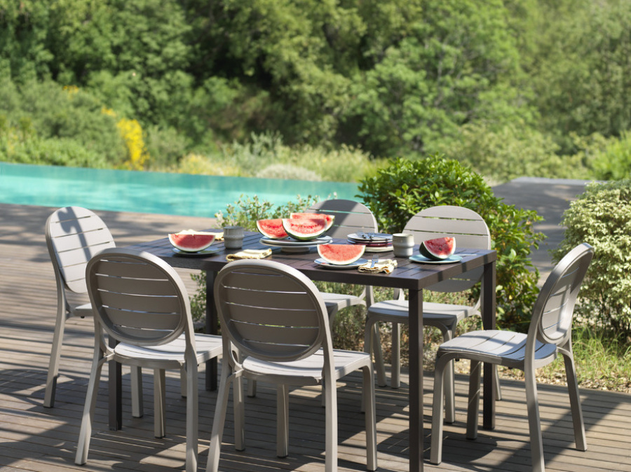 Piano DurelTOP in polipropilene trattato anti-UV, colorato in massa. Gambe in alluminio verniciato. Finitura opaca. Dotato di piedini regolabili. Resina riciclabile.