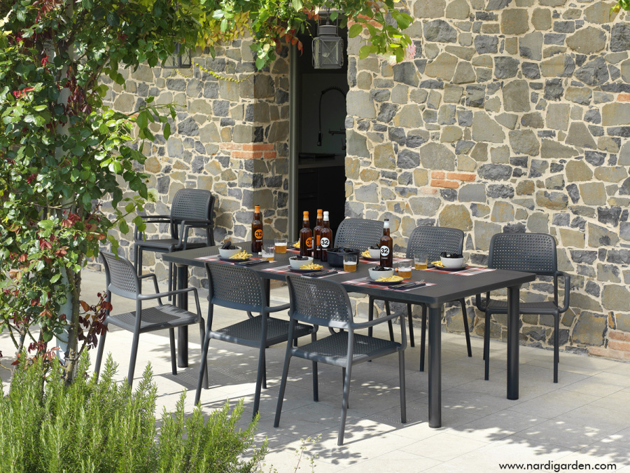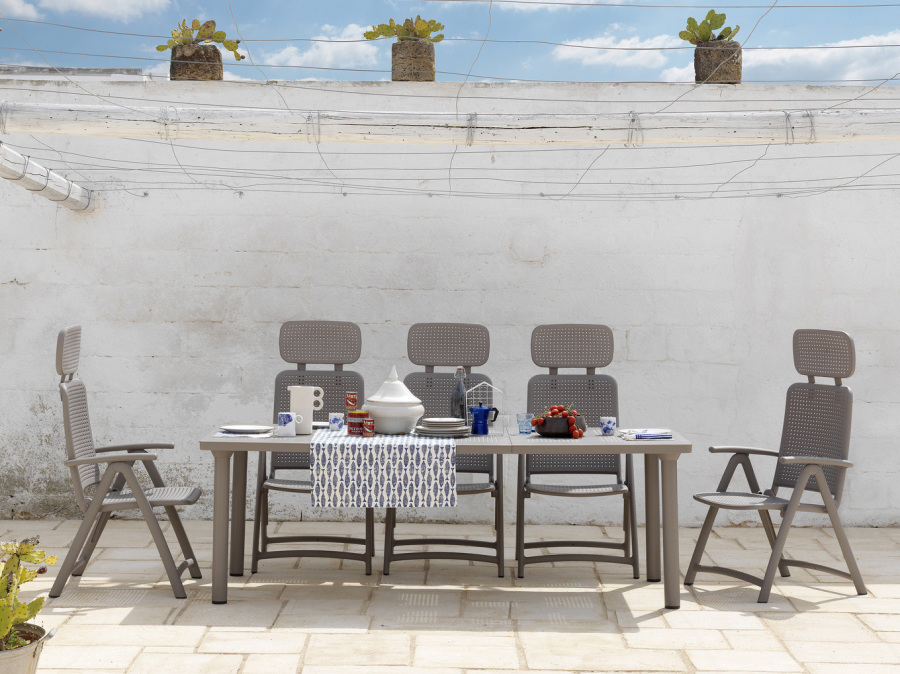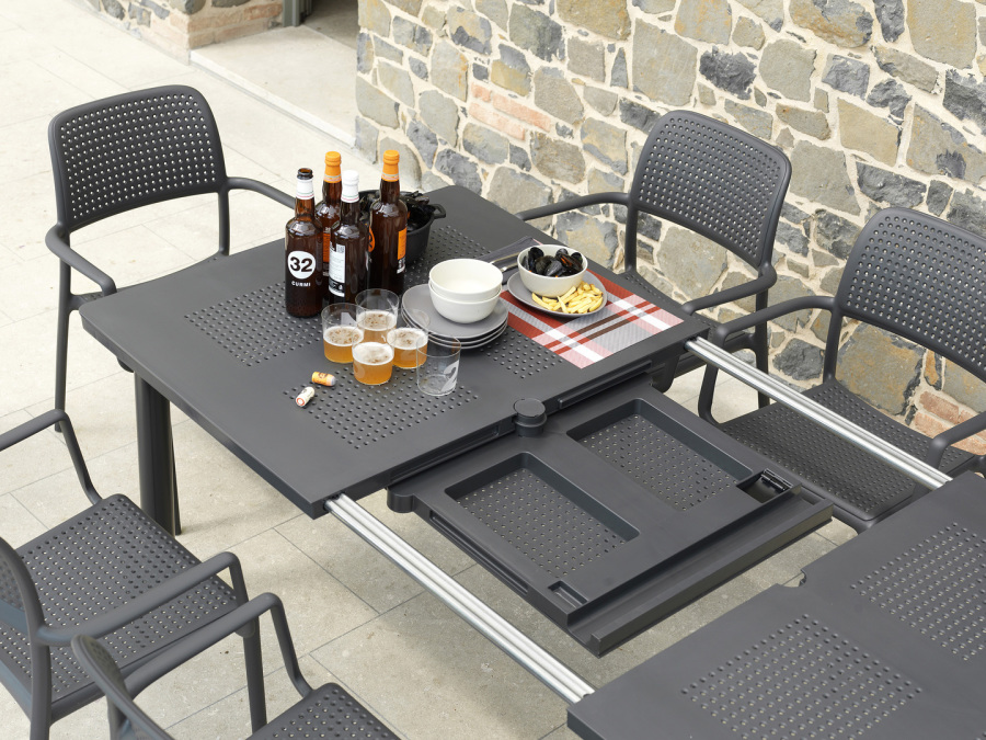 Tavolo allungabile per l’outdoor in polipropilene il cui design evoca i tradizionali arredi in ferro. Il piano è decorato da un motivo di piccoli fori che si ripetono in sequenza. Gambe a sezione rotonda avvitate al piano con un semplice sistema a vite.
