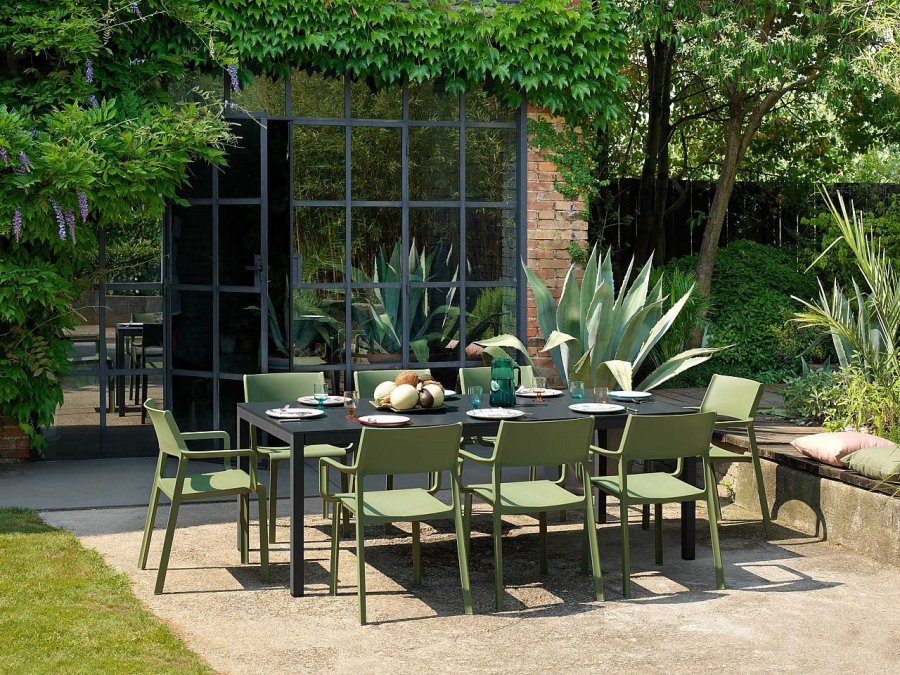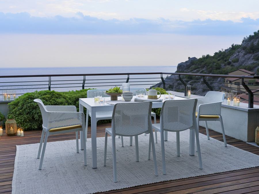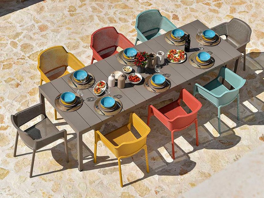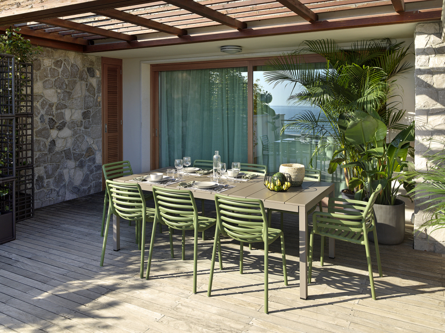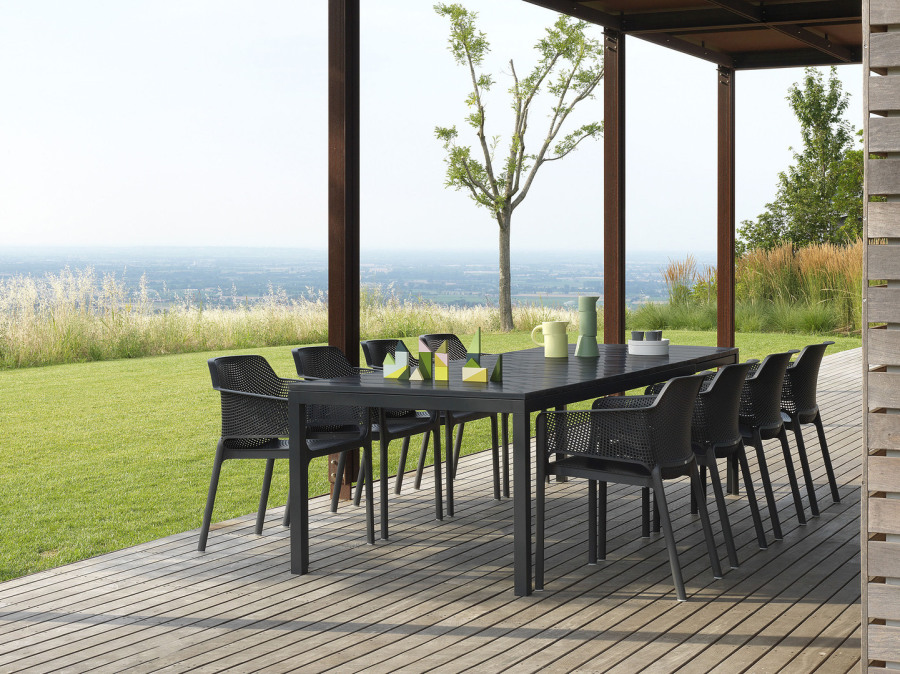 Tavolo allungabile. Piano DurelTOP in polipropilene trattato anti-UV, colorato in massa. Gambe in alluminio verniciato. Finitura opaca. Dotato di piedini regolabili. 140 - 210 x 85 x 76h cm. Resina riciclabile.