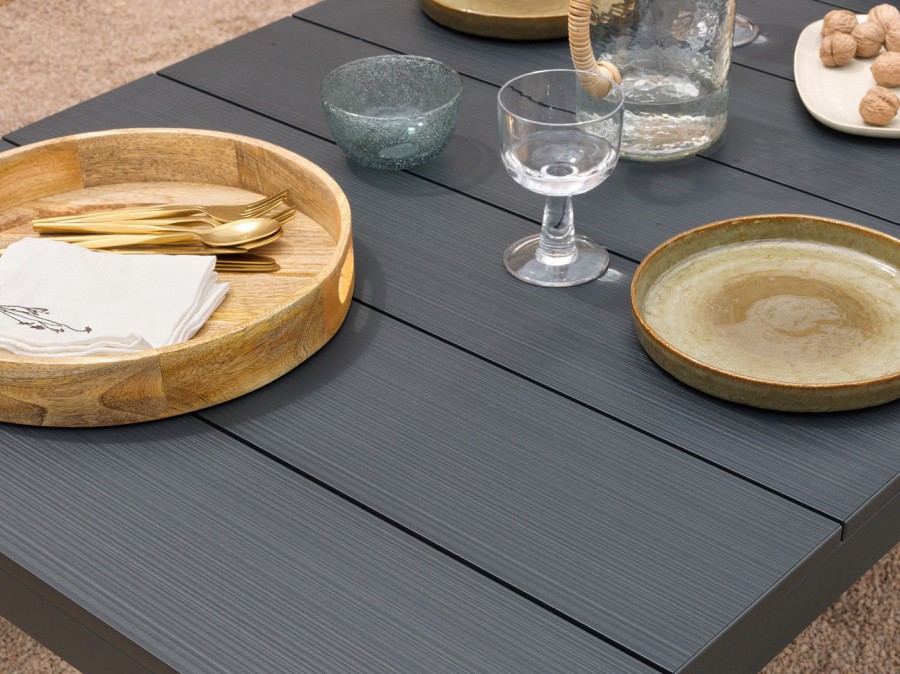 Rio Alu Fix è un tavolo con piano dogato in alluminio verniciato dalla texture righettata e struttura anch’essa in alluminio verniciato. Una spiccata personalità dai rigorosi toni architetturali e dall’aspetto materico.