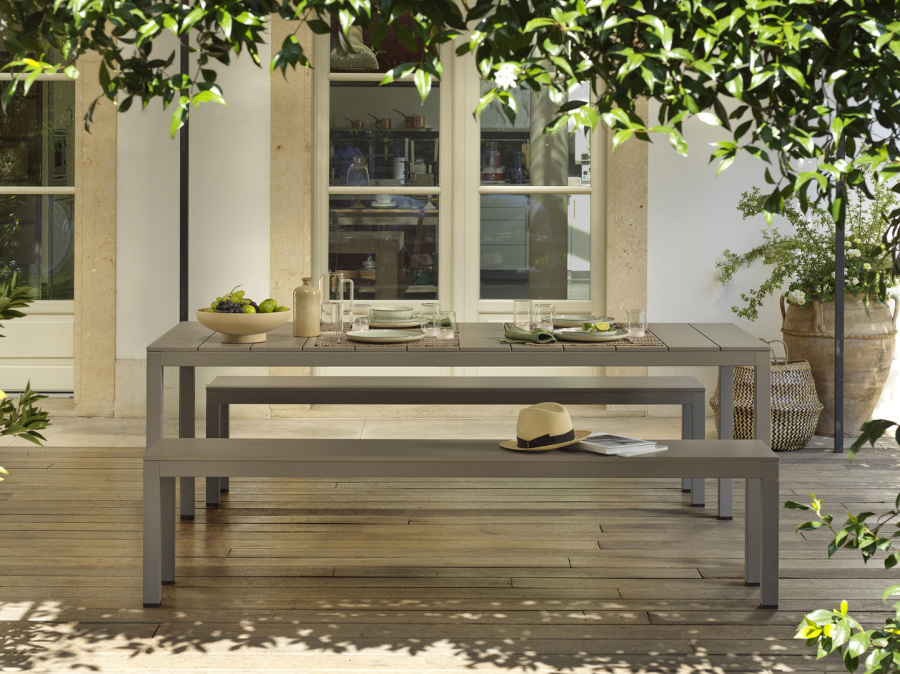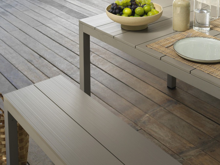 Tavolo fisso. 210 x 85 x 75h cm. Materiale: struttura e piano in alluminio verniciato.Dotato di piedini regolabili.