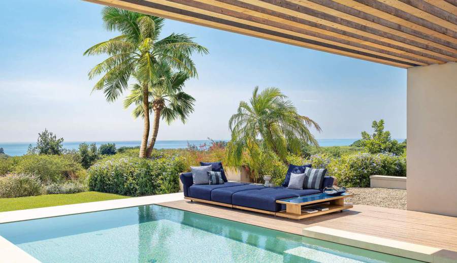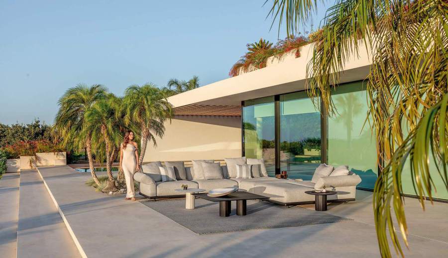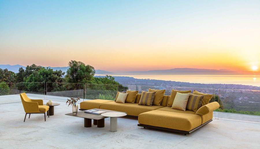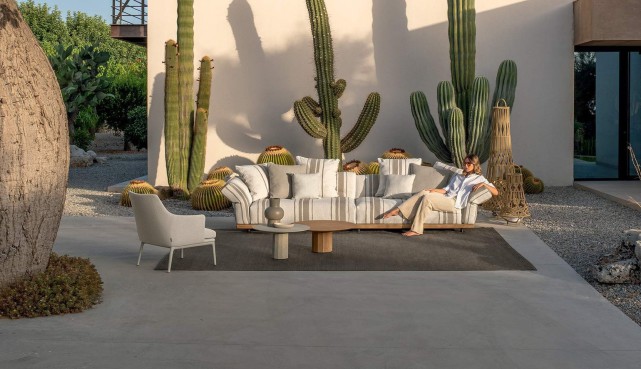 Elton è una collezione che sublima la capacità di Talenti di assottigliare i confini tra l’indoor e l’outdoor attraverso la ricercatezza delle forme e dei materiali. Una componibilità senza pari che introduce un nuovo modo di vivere gli spazi esterni: per la prima volta schienali e braccioli dei sofa diventano inclinabili grazie ad un meccanismo integrato nella struttura che ne consente la regolazione. Tecnologia a servizio del design, in grado di donare al divano una sinuosità estetica senza precedenti e di giocare sulla possibilità di personalizzare in toto il proprio comfort. La collezione si compone inoltre di tavoli caffè in caldo Accoya, natural o palissandro, impreziositi da eleganti top in vetro smaltato.