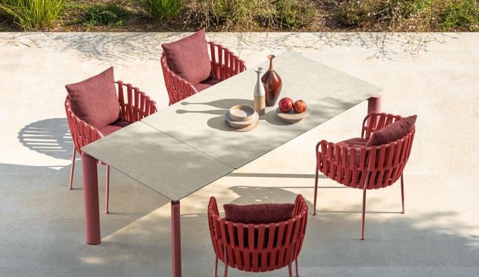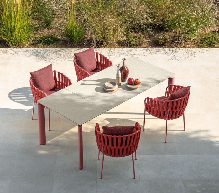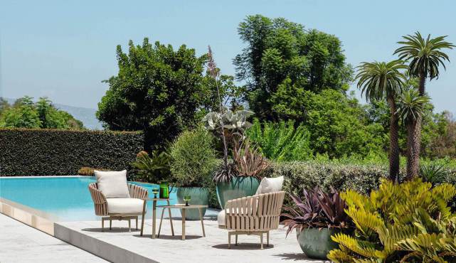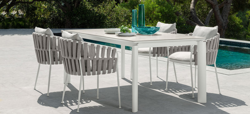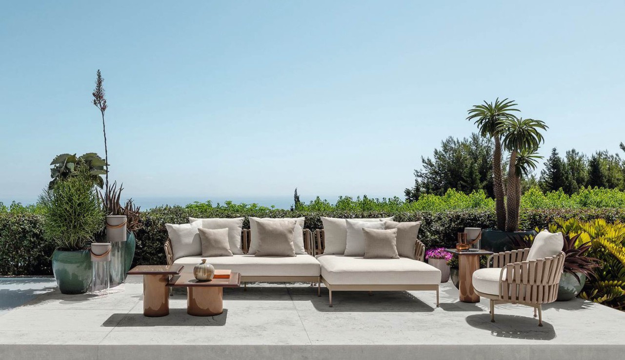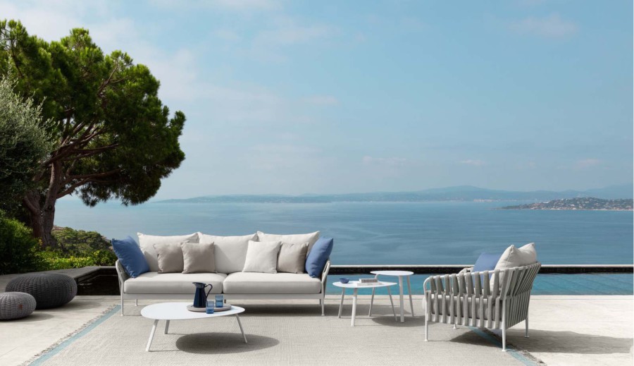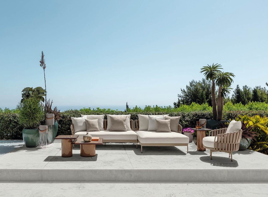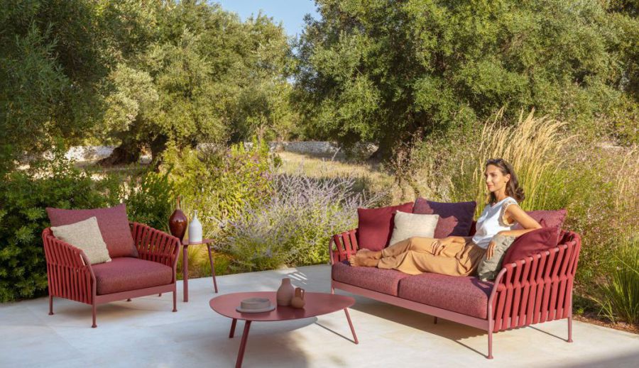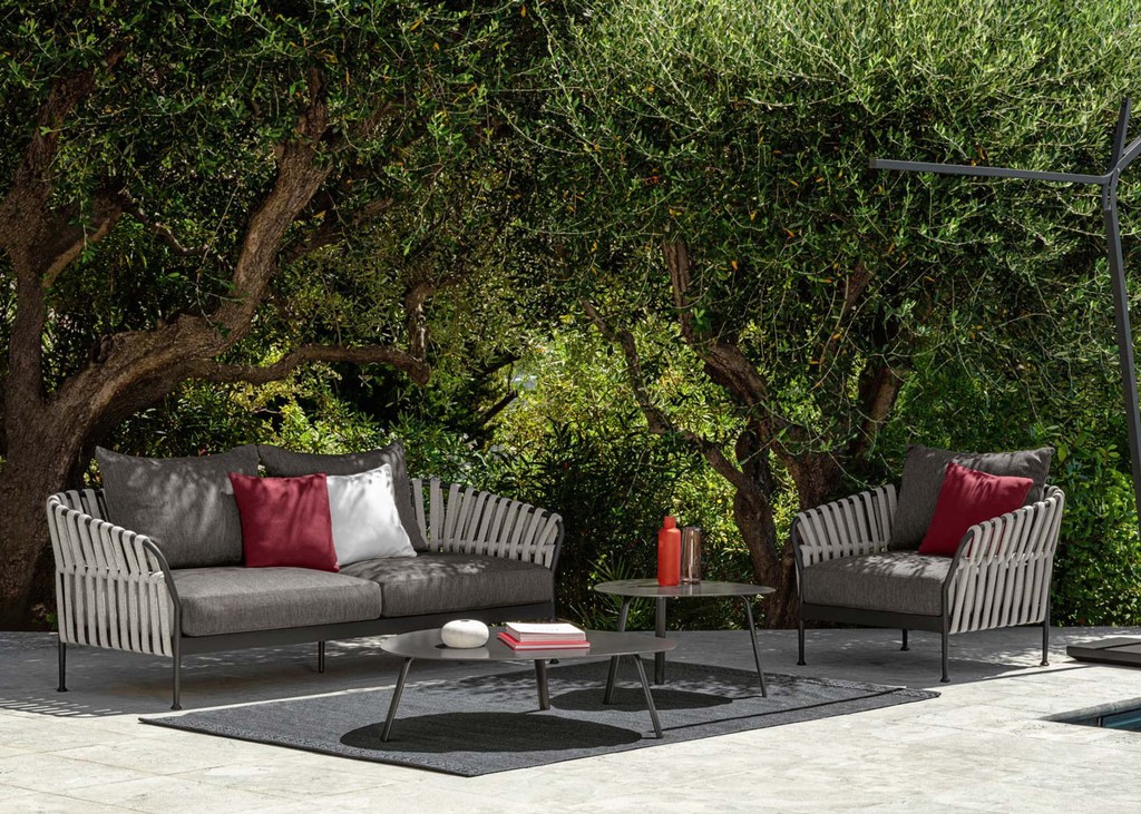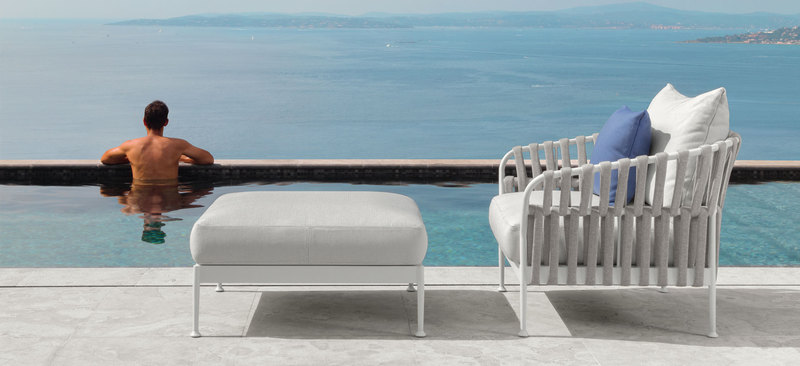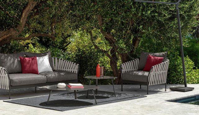 Caratterizzata dall’accostamento di strutture in alluminio, intrecci in corda e confortevoli cuscinature, indiscutibile la sua sensuale presenza nello spazio outdoor. L’intreccio della corda imbottita sulla struttura tubolare crea una finestra reticolata che regala affascinanti giochi di luce quando i raggi si posano sulle fessure. Volumi leggeri e sensuali per un perfetto relax outdoor e per una perfetta privacy visiva.