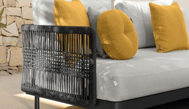 Le molteplici combinazioni consentono di creare uno spazio outdoor a misura delle proprie esigenze. L’eleganza e la leggerezza di questo divano modulare donano pulizia