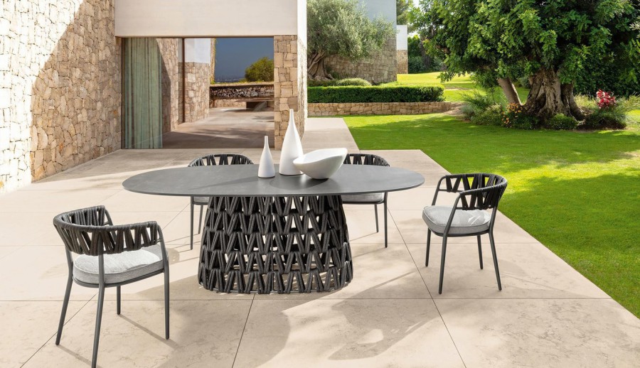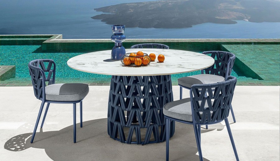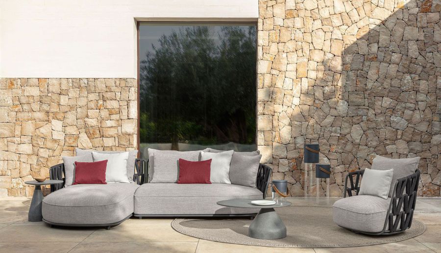 Disegnato dallo studio Palomba Serafini nasce Swipe, con la volontà di creare una collezione che, come evoca lo stesso nome, fosse dominata dal movimento. Un progetto che unisce estrema comodità a un design dalla forte personalità, caratterizzato dal contrasto tra le morbide linee delle sedute e le geometrie create dalle versatili corde imbottite. L’utilizzo dell’alluminio per la struttura non impedisce agli elementi di questa collezione di svilupparsi in totale assenza di rigidità: gli schienali di divani e poltrone contengono la cuscinatura generosa, aprendosi alle estremità, come ad accogliervi in un abbraccio, mentre gli elementi dining della collezione sembrano fluttuare in aria grazie al gioco di trasparenze della base a intreccio.