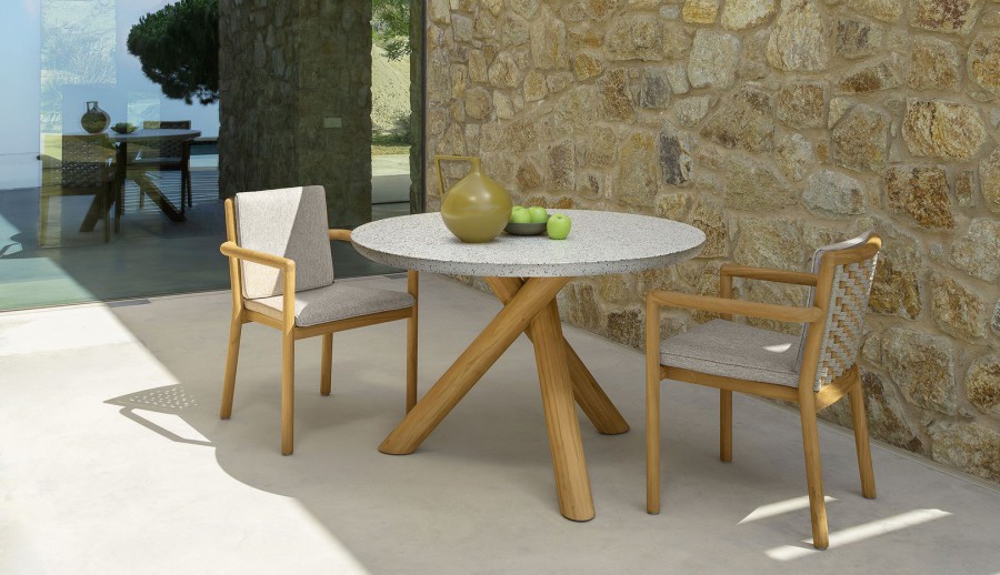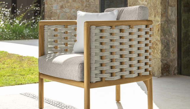Direttamente dai salotti in stile inglese, una collezione che comunica con l’ambiente naturale ma non vuole rinunciare alla compostezza tipica degli arredamenti indoor. Prichi si compone di un set living e uno dining cozy chic, caratterizzati dall’utilizzo di materiali che ben si adattano a una vasta gamma di architetture. I piani caffè dal taglio essenziale e moderno contrastano con l’elaborato intreccio di corde e legno che si sviluppa su schienali e braccioli, rendendo le sedute di questa collezione elementi d’arredo sofisticati.