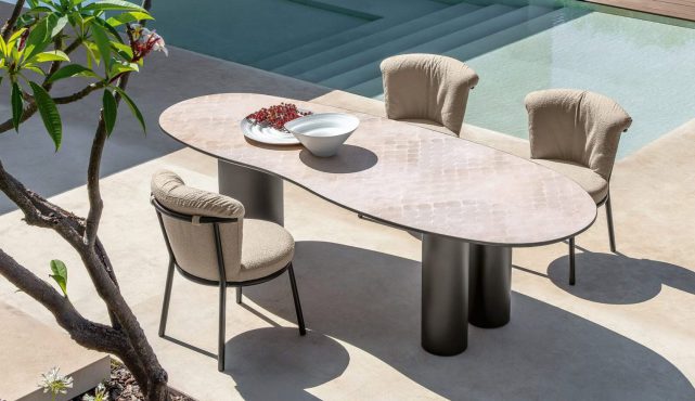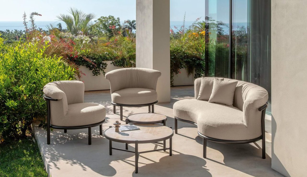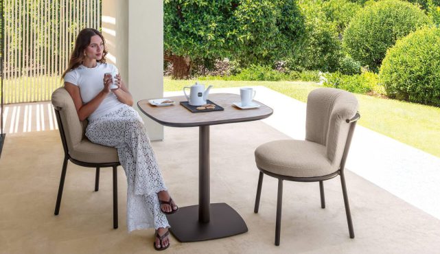 relax e al dialogo. La struttura in alluminio verniciato, solida ma leggera, sostiene una cuscineria avvolgente dalle proporzioni equilibrate, creando un equilibrio perfetto tra comfort e